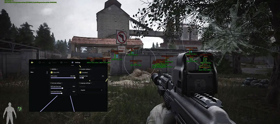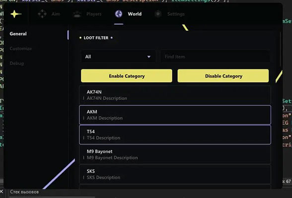 Функционал чита включает в себя продвинутую систему ESP, которая позволяет видеть игроков и ботов сквозь препятствия. Отображаются контуры (box), скелеты, текущие виды оружия и уровни здоровья врагов, обеспечивая полную осведомлённость на поле боя.