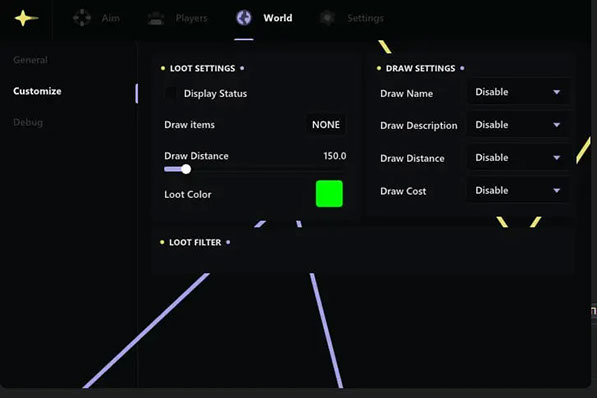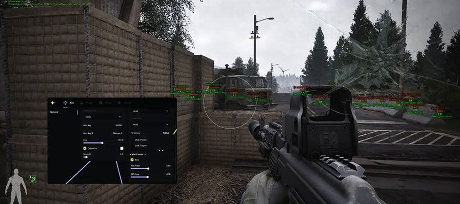 Модуль Aimbot реализован с широким набором параметров: можно выбрать тип прицеливания, назначить две клавиши активации, указать ключевые зоны для наводки (голова, тело), регулировать радиус действия (FOV) и плавность наведения, а также использовать опцию "только по видимым целям". Система автоматической фиксации на цели и функция контроля отдачи (RCS) делают стрельбу максимально точной и естественной.
