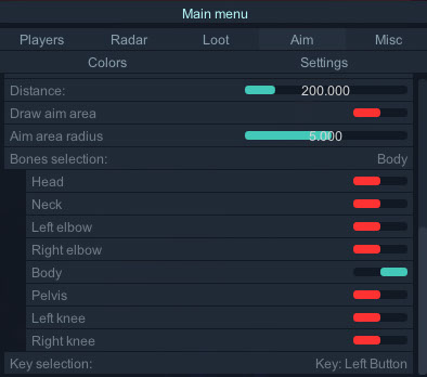 Key selection: / Установить клавишу для активации аимбота, для работы аимбота установленную клавишу необходимо зажимать и удерживать
