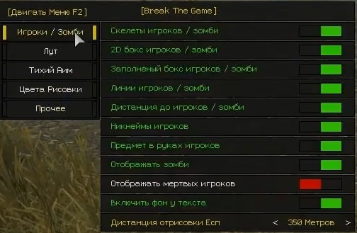 Рабочий приватный чит BTG для игры DayZ разработал опытный СНГ программист. У него есть множество успешных проектов, которые вы сможете найти на нашем сайте. Софт регулярно обновляют и поддерживают. Считаю его проекты одними из самых удачных, т.к. удаётся обходить античит и поддерживать программы в состоянии с минимальным шансом блокировки. Чит DayZ включил в себе все необходимые функции для успешных побед и выживания. Детально прорисованный WallHack покажет вам местоположение даже самых скрытных врагов. Дополнительно сможете подсветить различный лут. Точный AImBot от которого не сможет убежать ни один соперник.
