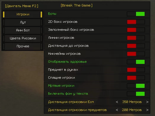 Представляем вашему вниманию актуальный приватный чит для игры RUST - BTG. Софт создал проверенный разработчик, у которого в арсенале множество рабочих читов к популярным шутерам. В создании чита использовали современную разработку обхода античита, которая хорошо себя зарекомендовала в других проектах. В программу включили все необходимые функции, которые помогут успешно выживать и выселять соседей вокруг. Детально прорисованный WallHack, который сможет отобразить скелеты врагов. Много дополнительных регулировок по типу выставления линий, дистанции имён, здоровья соперников. Дополнительно вы сможете подсветить лут, животных, машины.