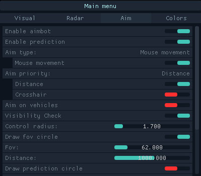 Аимбот в этом чите реализован через управление движением мыши, что делает наведение максимально естественным. Можно выбирать приоритеты работы — по прицелу или по расстоянию до цели, а также включать прицеливание по игрокам в технике. Доступна проверка видимости, настройка радиуса контроля и FOV-круга, ограничение дистанции срабатывания и выбор конкретной части тела для стрельбы. Активация выполняется зажимом выбранной клавиши, что исключает случайные выстрелы.