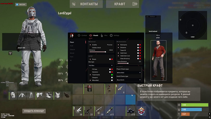 Doza RUST Full — это один из самых мощных и надёжных софтов для Rust, созданный для тех, кто хочет полностью контролировать игру. Благодаря аимботу, ESP и множеству дополнительных функций чит открывает перед игроком новые возможности: видеть врагов, ресурсы и транспорт, быстрее реагировать и всегда оставаться на шаг впереди соперников.
