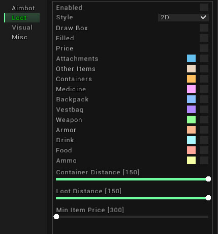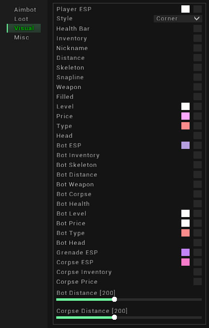 Система ESP в Dullwave — это полный контроль ситуации. Подсвечиваются игроки, боты, тела, здоровье, уровень, инвентарь, тип цели, оружие и прочее. Для лута можно фильтровать предметы по цене, типу, контейнерам, медицинским ресурсам, еде, броне, оружию, боеприпасам, рюкзакам — всё это видно заранее, с возможностью регулировать дистанции отображения.