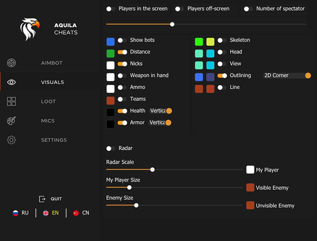 Visual - это функция, которая помогает вам видеть противников и другие объекты на экране. Вы можете установить количество видимых и невидимых игроков, показывать ботов, отображать ники, команду, здоровье, скелет и другие характеристики противников. Также доступны функции обводки, линий, радара и масштабирования радара.