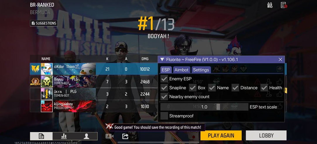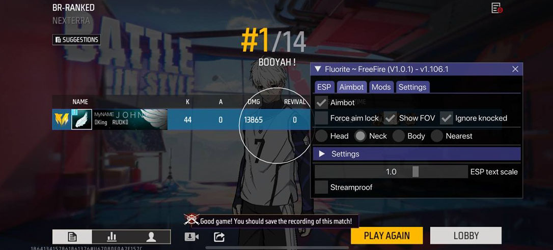 Длительное время была возможность продажи чита Fluorite для игры Free Fire, но я почему то ей не пользовался. Видимо был слишком увлечен читами для PUBG. Либо ждал качественного возвращения Fluorite для королевской битвы. В итоге, проходил постоянно мимо. Но их программа актуальная, рабочая. Получает все необходимые регулярные обновления и показывает минимальный шанс блокировки длительное время.