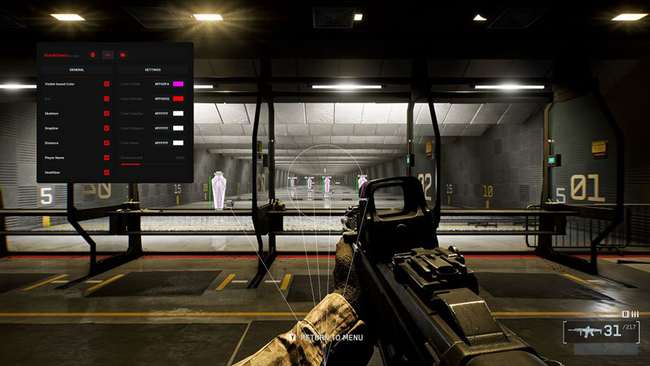 Aimbot è dotato di impostazioni di campo visivo, livellamento e posizione di mira, che ti consentono di adattare il tiro a qualsiasi stile di gioco, da quello attento a quello più aggressivo. Il controllo della visibilità del bersaglio riduce il numero di colpi sospetti e la chiave di attivazione assegnabile offre il pieno controllo sulla funzione.