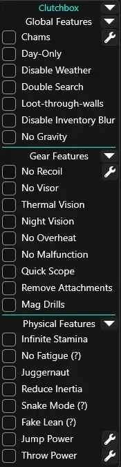 Clutchbox EFT DMA è un componente aggiuntivo per il radar Clutch DMA per Escape From Tarkov. Non funziona senza il Clutch Radar. Clutchbox aggiunge potenti funzionalità di gioco: sistema completo No Recoil con regolazione fine di ogni parametro, Chams per la visualizzazione del giocatore, controllo del tempo e della visibilità (Solo giorno, Disattiva meteo, Disattiva nebbia, Visione termica/notturna), bottino attraverso i muri, resistenza infinita, Nessuna gravità e molto altro. Funziona tramite scheda DMA su un secondo PC: completamente invisibile all'anti-cheat di BattlEye.