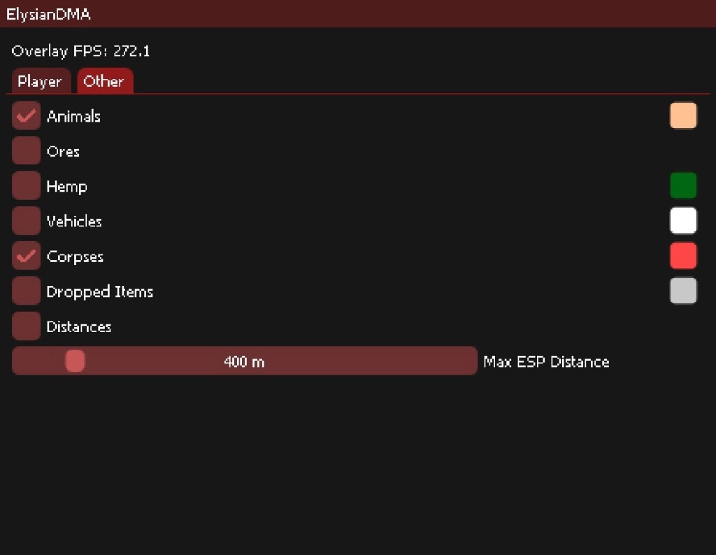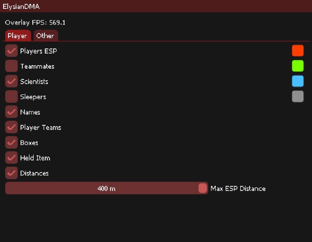 La funzionalità è costruita attorno a un potente ESP che mostra giocatori, compagni di squadra, scienziati, dormienti, i loro nomi, squadre, distanza, scatole 2D e l'oggetto attivo in mano. Per il controllo completo del territorio, sono disponibili segnalini ESP per animali, risorse (pietra, metallo, zolfo), canapa, veicoli, cadaveri e oggetti lasciati cadere. Ogni tipo di ESP ha un limite di distanza separato, che ti consente di personalizzare il display in base al tuo stile di gioco.