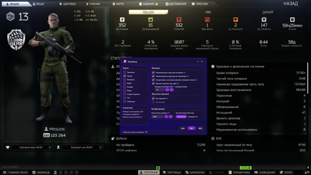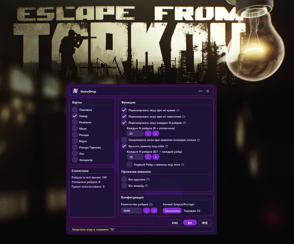 Un nuovo rivoluzionario KD Dropper per Escape from Tarkov! Stanco di arresti anomali infiniti con script gratuiti? Stufo di installare Python e ahk? NeiroDrop è una soluzione che funziona in 2 clic: inserisci la chiave, scegli un pulsante, avvia il gioco e vai a prendere un caffè.