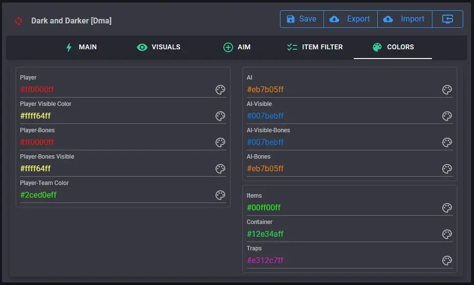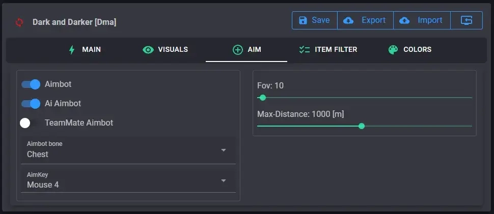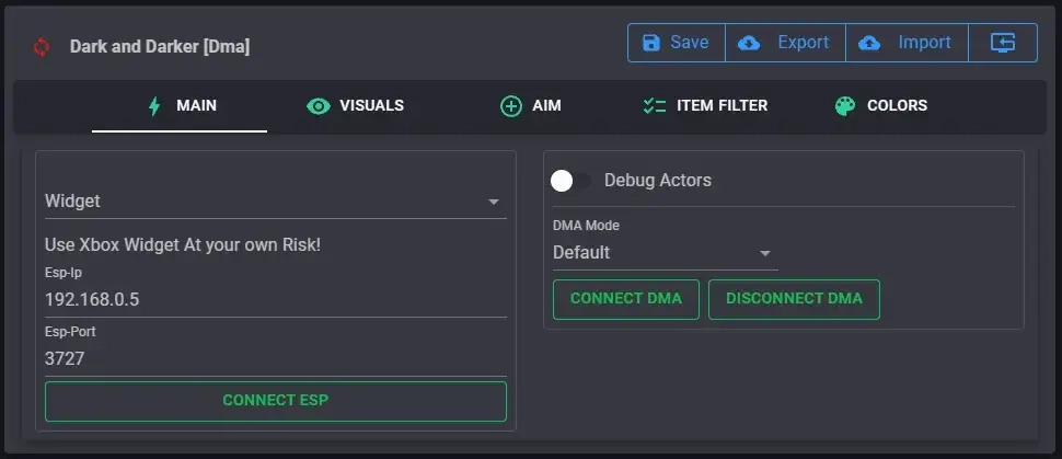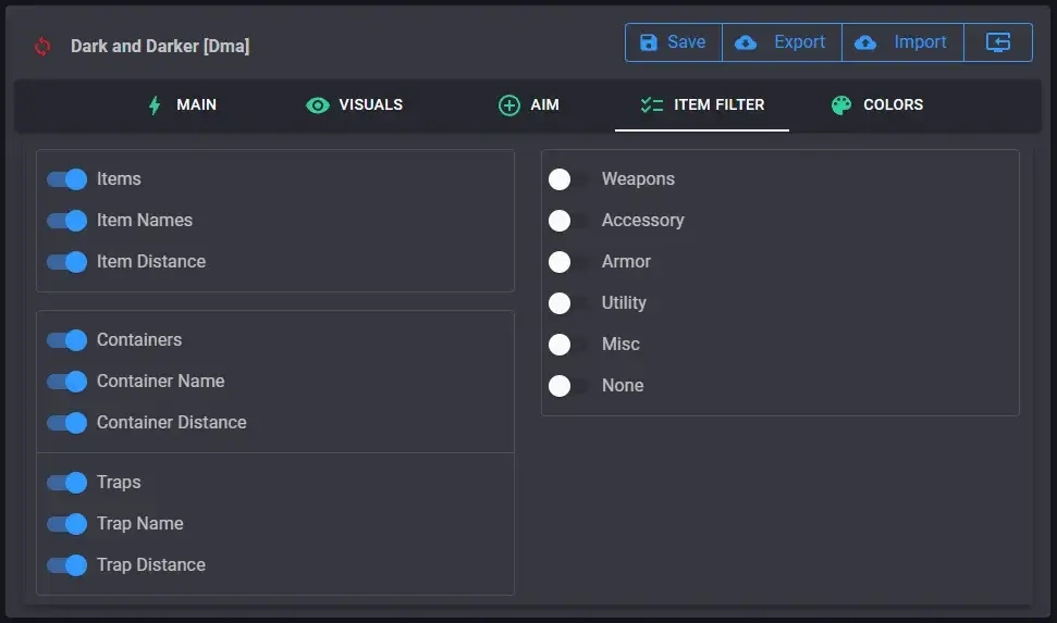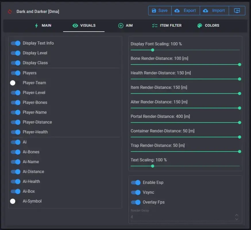Clutch Dark および Darker DMA — Dark および Darker 用のプライベート DMA チートで、DMA カードを介して 2 台目のコンピュータで実行されます。 ダンジョンでの完全な優位性を提供します: レンダリング距離を調整できるプレイヤー、Mob、アイテム、コンテナ、トラップの ESP。 AI 照準と微調整された FOV、エイムボーン、距離設定を備えた内蔵 Aimbot。 柔軟なアイテム フィルターを使用すると、表示するアイテム タイプ (武器、防具、アクセサリー、ユーティリティ) を選択できます。 すべてのオブジェクト タイプの配色を完全にカスタマイズできます。 DMA テクノロジーのおかげで、チートはゲーミング PC の外部で実行され、EAC アンチチートには認識されません。 PC、スマートフォン、タブレットなど、どのデバイスからでもブラウザ経由で制御できます。