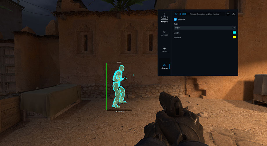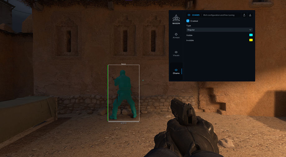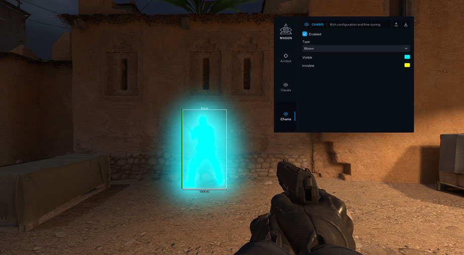 Кроме того, в Mason Internal присутствует полноценный ESP, который отображает на экране здоровье, имена, тип оружия, количество патронов и текущие статусы врагов. Для лучшей ориентации в бою поддерживаются chams-модели, позволяющие видеть как видимых, так и скрытых противников сквозь стены.