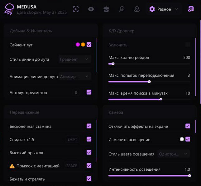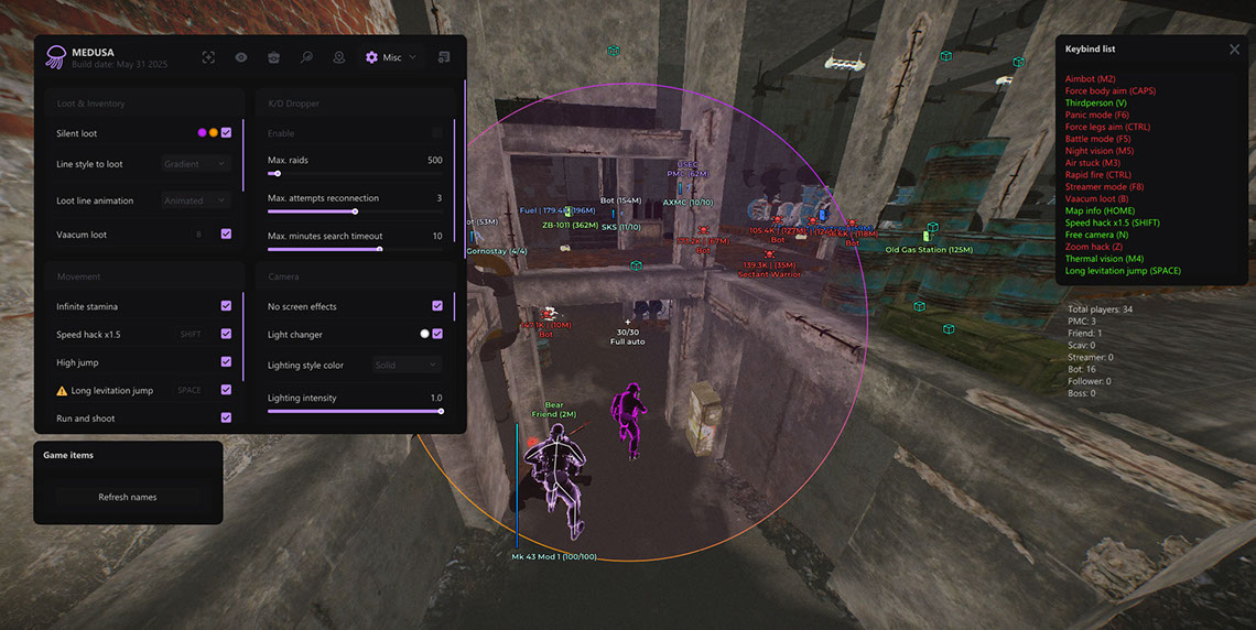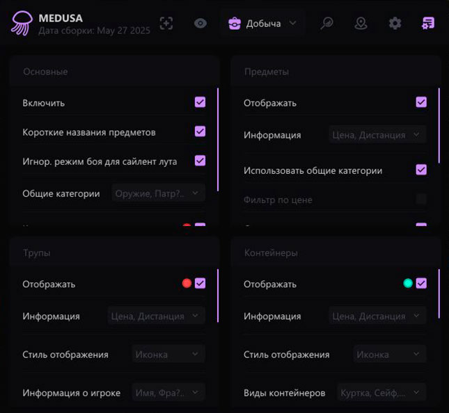 Medusa для игры Escape from Tarkov - надежный приватный чит без вирусов, работает с минимальным шансом блокировки. После оплаты получаете качественный продукт, который использует современный способ обхода античита. Работает регулярно обновляют и поддерживают свой продукт. Программа хорошо себя зарекомендовала, поэтому, после месяца активных продаж другими посредниками мы её выложили. Подробно расписали возможности программы. В случае возникновения трудностей с запуском и установкой - сможем помочь и ответить на все возникающие вопросы.