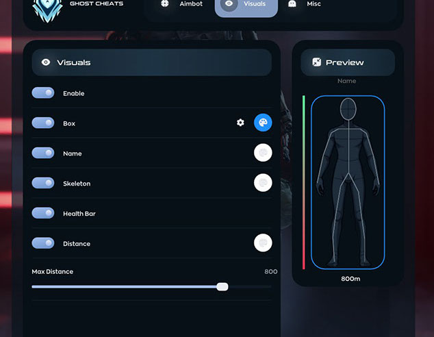 - Отображение боксов вокруг врагов, их имен, здоровья и скелетов.