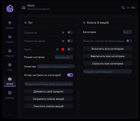 - Предметы рядом: фон, качество, категория, дистанция, имя, иконка