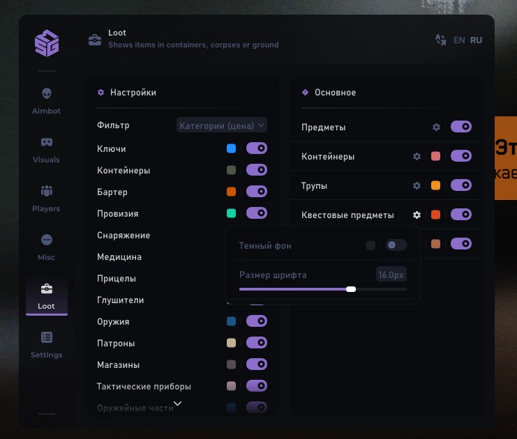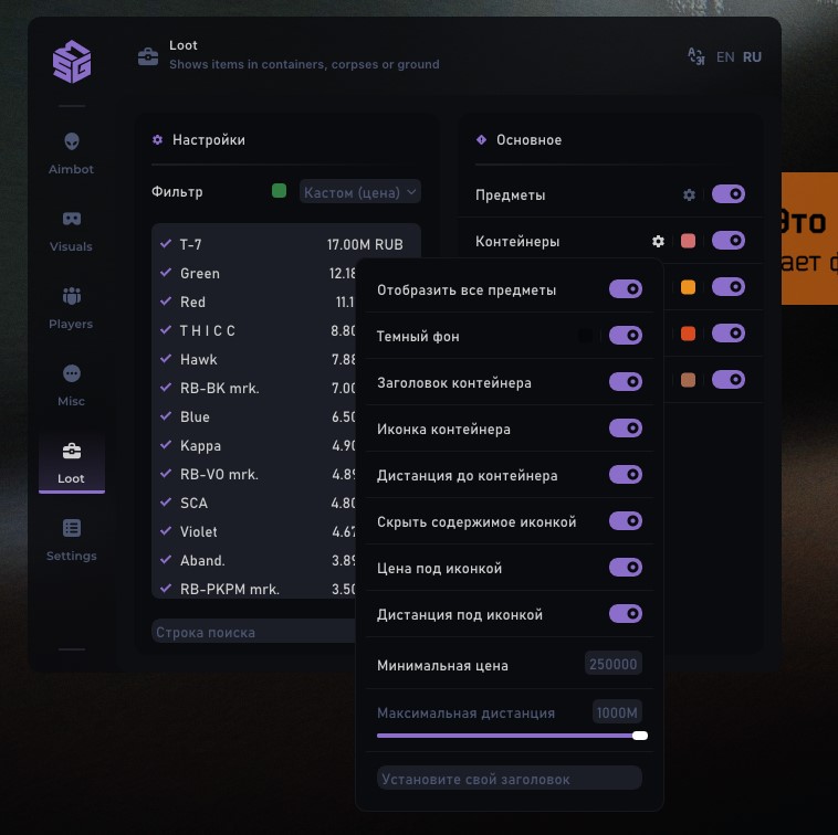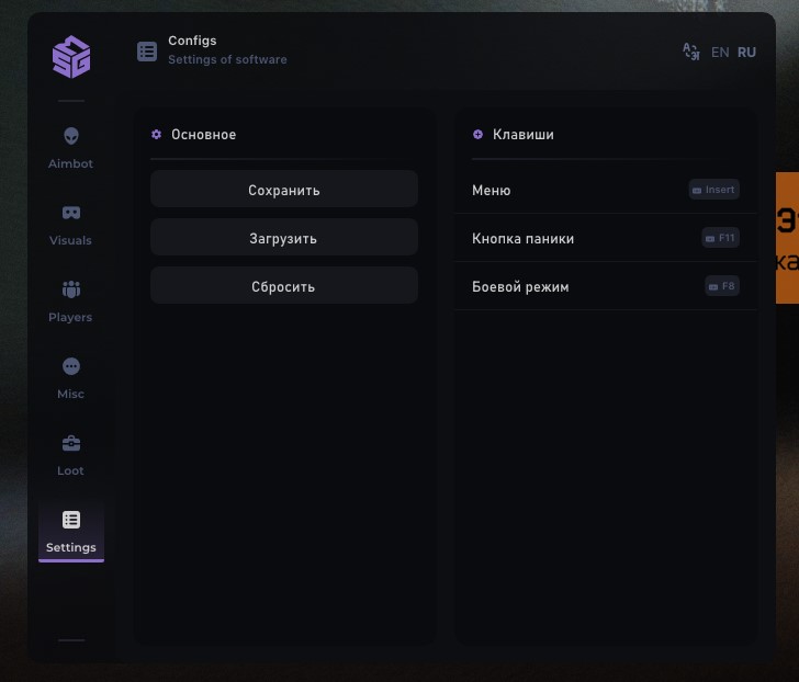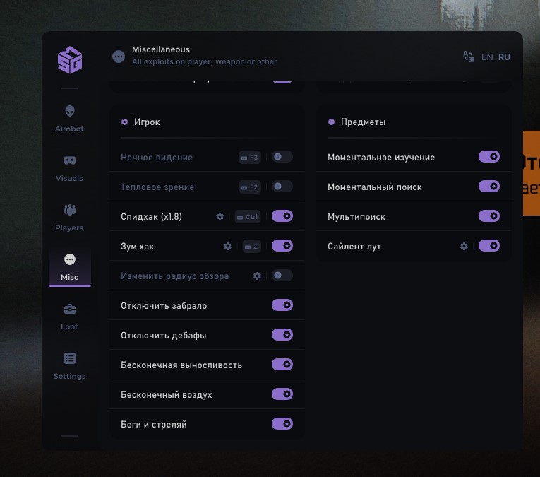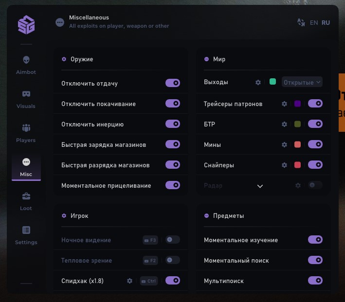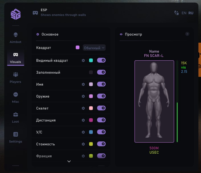 У программы проработанный адаптивный overlay, который не нагружает систему. Подходит для : Уверенной легитной игры, лутинга, квестов, раскачки. Подойдет для РМТ либо для RAGE игры если нужна доминация на карте. Функция Instahit - обеспечивает вам 100% убийство противника на любом расстоянии вплоть до 2км.