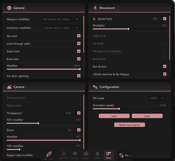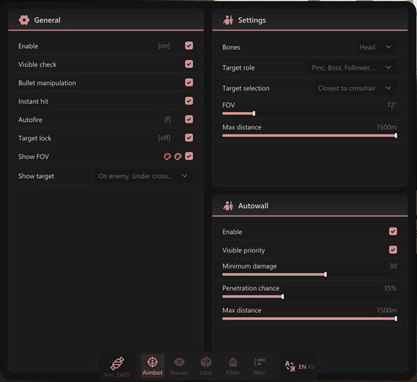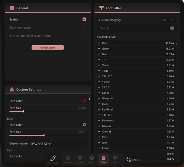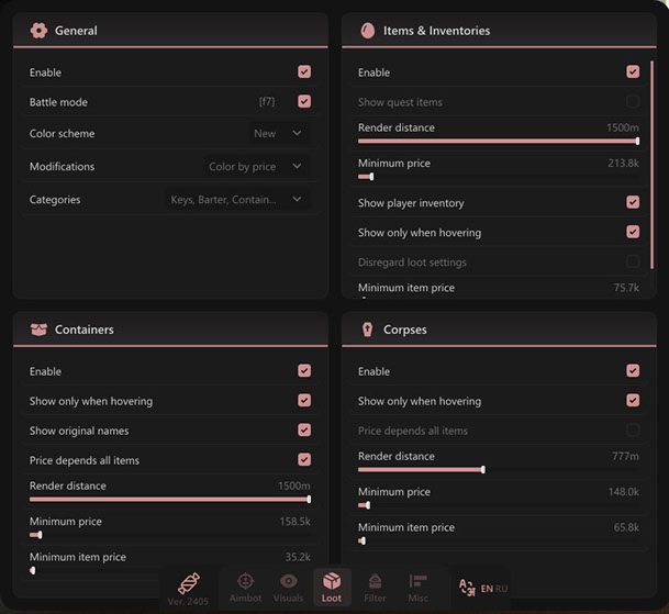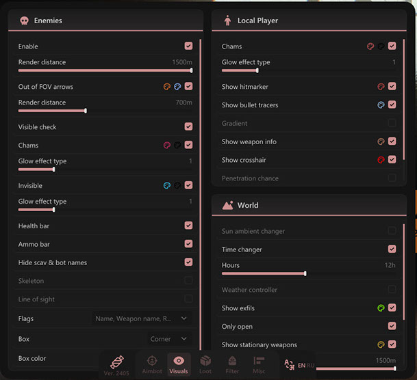 Мощный приватный чит Sugar Elite для игры Escape from Tarkov. Новая разработка создателей Chams, Sugar, VX, Aithority. Такое ощущение, что все программы для EFT делает один и тот же человек. Практически так, большинство. В Sugar Elite более 100 различных функций, кастомный лут, хороший аим бот. Сможете лутать через стены. По крайней мере, на момент написания статьи - работало. Абсолютно не стандартный функционал, лутание любых закрытых контейнеров без ключей, быстрый бег, скрытый лут без открытия, прострел карты и текстуры. Не садит FPS и отлично подходит для легитной и рейдж игры.