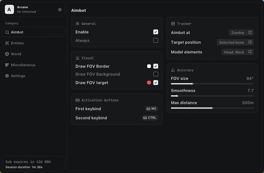 Arcane - это современная программа для игры Unturned, которая разработана для предоставления игрокам преимущества в бою над противниками. Чит регулярно обновляется для обеспечения совместимости с последними версиями игры и безопасности использования. Arcane отличается стабильной работой, интуитивным интерфейсом и мощным функционалом, который помогает доминировать в PvP-боях.
